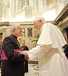 Bento XVI cumprimenta o Cardeal Leonardo Sandri durante a assembleia anual da Reunião das Obras para a Ajuda das Igrejas Orientais (ROACO)